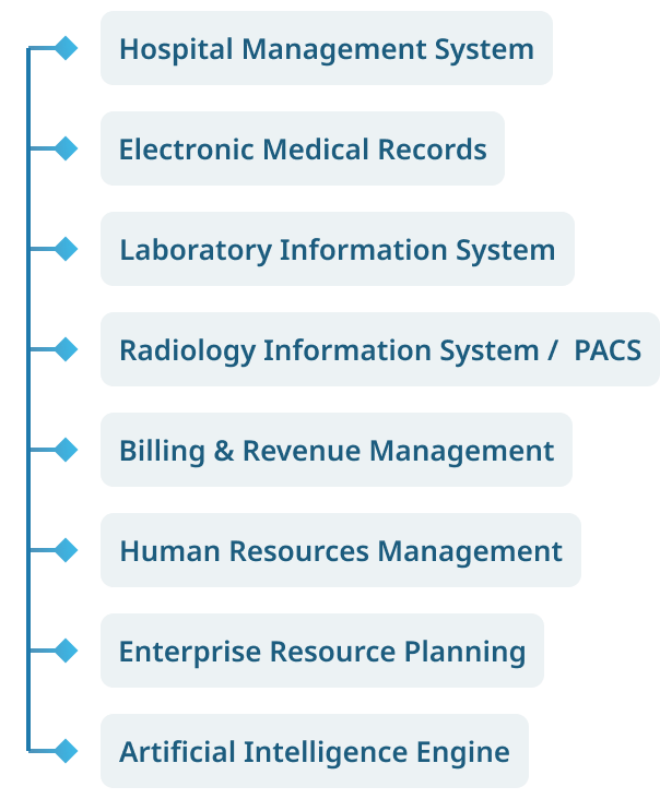 All core hospital modules including HR, EMR, Billing, ERP, LIS, RIS/PACS, and AI unified in one integrated platform.